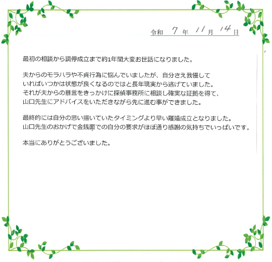 | 夫からの暴言をきっかけに探偵事務所に相談し確実な証拠を得て、山口先生にアドバイスをいただきながら先に進む事ができました。