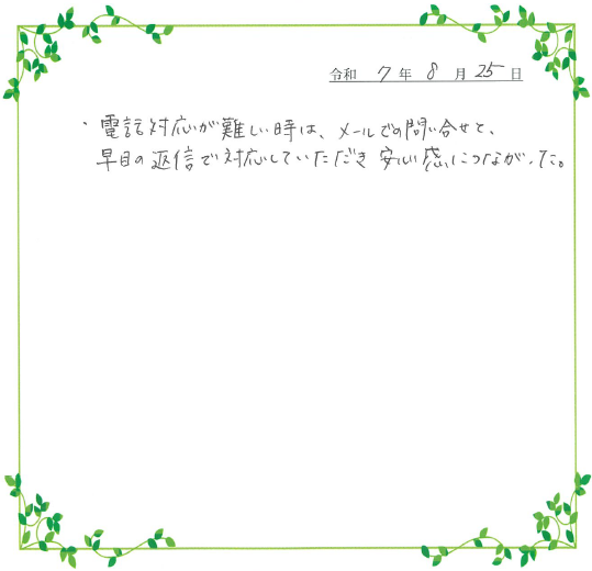 電話対応が難しい時は、メールでの問い合せと、早目の返信で対応していただき、安心感につながった。 |
