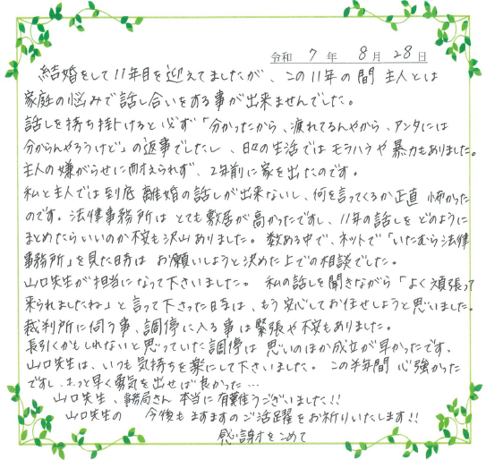 調停時も、初めての事ばかりで不安や緊張がありましたが、山口先生は気さくに話しかけて下さったので、安心し、心強かったです。 無事に離婚調停が成立し、とても嬉しく思っています。 山口先生にお願いして、本当に良かったと思っています。ありがとうございました。 |